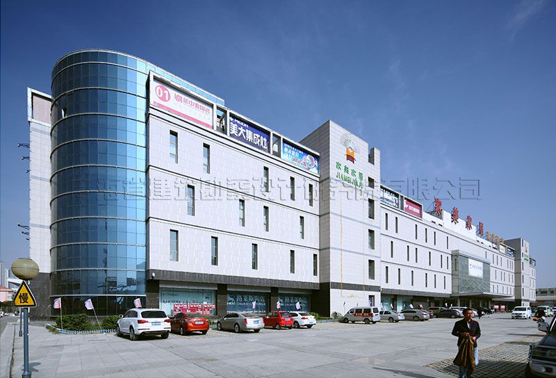 建筑體型為矩形,建筑立面窗采用亂碼窗的分割方式,石材幕墻錯縫排列,并采用表面不同質感的石材加強實體墻的視覺效果,窗與實體墻比例劃分恰當,分格細膩,體塊規(guī)整大氣,端莊得體,體現(xiàn)大型賣場建筑的性格特征。