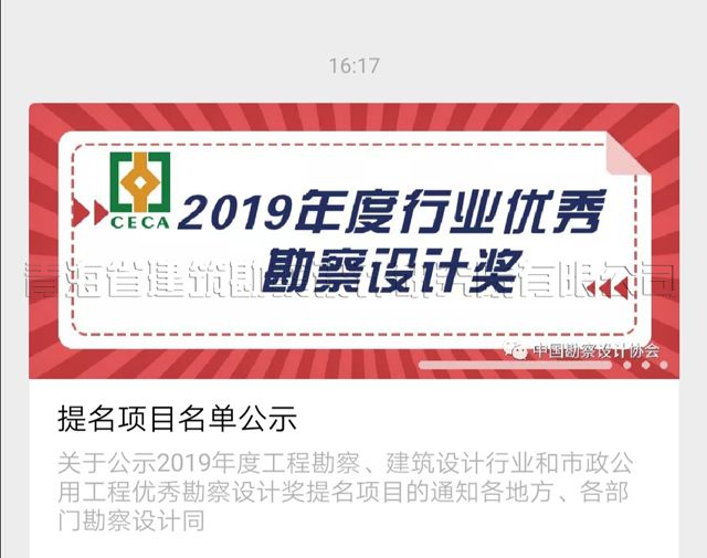 近期,根據(jù)中國(guó)勘察設(shè)計(jì)協(xié)會(huì)《關(guān)于公示2019年度工程勘察、建筑設(shè)計(jì)行業(yè)和市政公用工程優(yōu)秀勘察設(shè)計(jì)獎(jiǎng)提名項(xiàng)目的通知》(中設(shè)協(xié)字[2019]125號(hào)),我公司設(shè)計(jì)的“青海國(guó)投廣場(chǎng)”獲2019年度工程勘察、建筑設(shè)計(jì)行業(yè)和市政公用工程優(yōu)秀勘察設(shè)計(jì)獎(jiǎng)提名項(xiàng)目二等獎(jiǎng)。