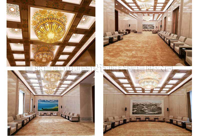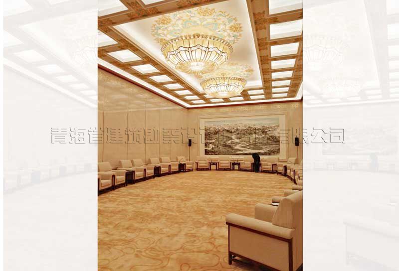 人民大會堂青海廳根據(jù)全國人民大會堂管理局安排重新調(diào)整位置,需要重新裝修改造。新青海廳位于人民大會堂Ⅱ段三層?xùn)|南角,北側(cè)與人民大會堂金色大廳和三層小禮堂相對,南側(cè)面向人大辦公樓內(nèi)院。位置與金色大廳和小禮堂位置靠近,原功能為領(lǐng)導(dǎo)人休息廳。青海廳總建筑面積350平方米,會議廳平面尺寸為29.3米×8.0米狹長的空間,建筑內(nèi)表面積為222.68平方米,廳內(nèi)原設(shè)計設(shè)變形縫,中間約2/5處設(shè)框架柱,吊頂高度5.0米左右,周邊設(shè)有服務(wù)間、衛(wèi)生間、配電間等服務(wù)設(shè)施。原裝修為2000年裝修改造工程。廳室尺寸為一狹長空間,長寬比達到1:3.67,空間比例很不協(xié)調(diào),為改造裝修工程帶來較大的難度,也是改造工程的重點。