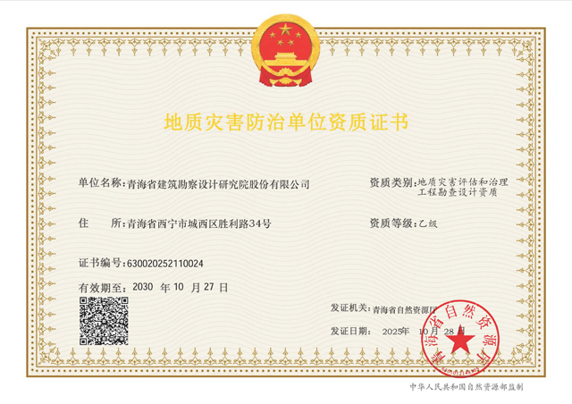 近日,公司獲得由青海省自然資源廳頒發(fā)的“地質(zhì)災(zāi)害評(píng)估和治理工程勘查設(shè)計(jì)資質(zhì)(乙級(jí))”,標(biāo)志著公司在地質(zhì)災(zāi)害防治領(lǐng)域的業(yè)務(wù)能力和專(zhuān)業(yè)實(shí)力邁上新的臺(tái)階。