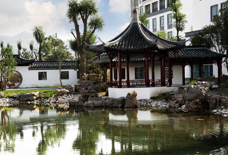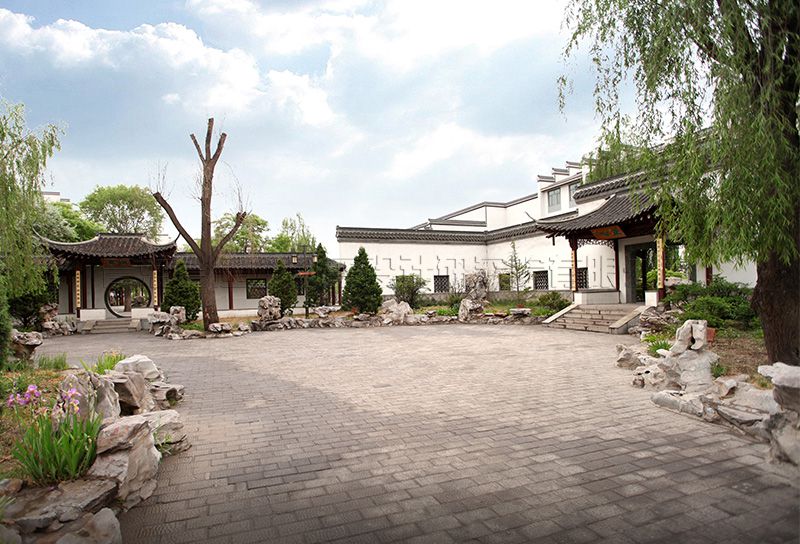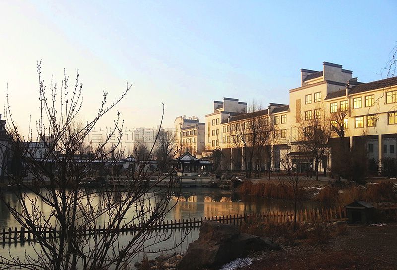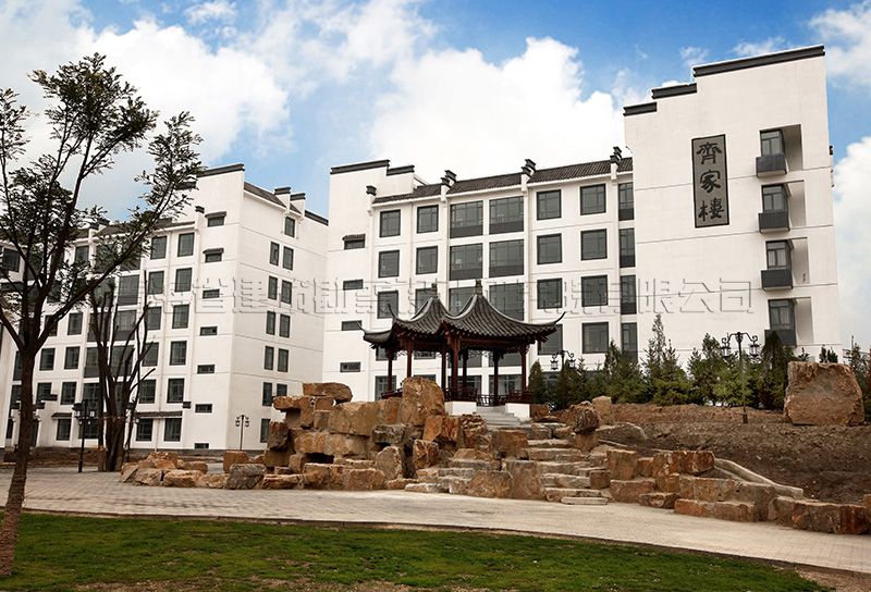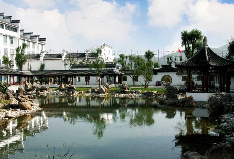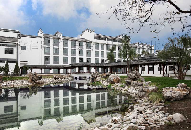 校區(qū)主入口設在南端,人流出入口寬24米,車流設9米寬獨立出入口,遠離城市主干道,通過校區(qū)主要入口進入校前廣場,辦公區(qū)布置在廣場東側(cè)靠規(guī)劃路,教學區(qū)布置在廣場西側(cè)最安靜區(qū)域,餐廳及宿舍布置在西北角,400米運動場布置在用地東北角,臨城市主干道。規(guī)劃采用集中緊湊的功能布局結構,將教學、生活及運動區(qū)用簡潔三角形空間連接,最大限度縮短師生步行距離,并通過大小不同的主題廣場、綠化、湖面將三部分有機連為一體。在學校的創(chuàng)作中,建筑師結合學校辦學思想和理念,確認以“簡徽”建筑風格及“蘇州”園林景觀的設計思路,通過對設計思路反復論證、研討、修訂,歷時一年完成新校建筑設計方案及施工圖設計。